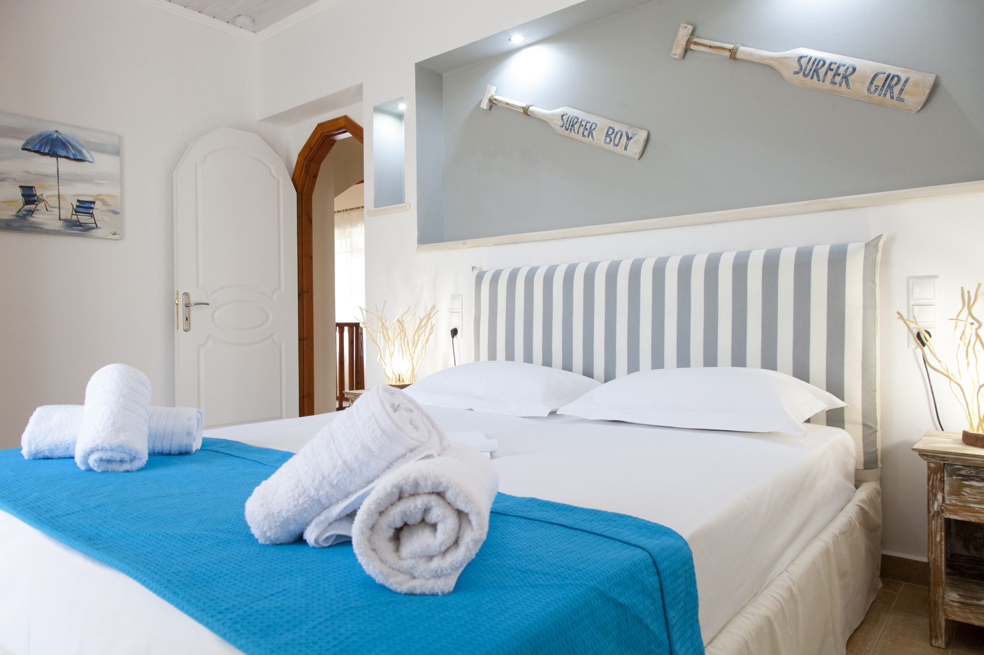 The kitchen is fully equipped with a cooker, microwave, fridge, dish washer, coffee machines, taosters, kettle and generally all the necessary cooking utensils. Moreover, there is a table with 4 chairs and a kitchen counter with 4 wooden stools. A big round staircase will lead you to the first floor where you can find 4 bedrooms and 2 bathrooms.
